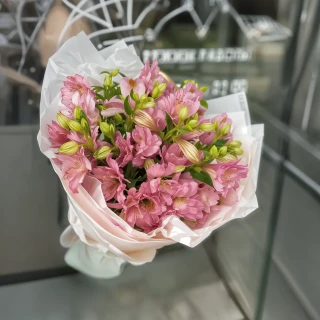 Этот букет воплощает нежность, элегантность и чувственность. Задумчиво составленные альстромерии, с их изящными контурами и пастельными оттенками, создают мягкое и романтичное настроение. Изящная паковка, украшенная деликатным атласным бантом, придает этому букету финальные штрихи приятности и нежности. Уникальность этого букета заключается в его способности подарить волшебный момент чистой радости и нежной любви.